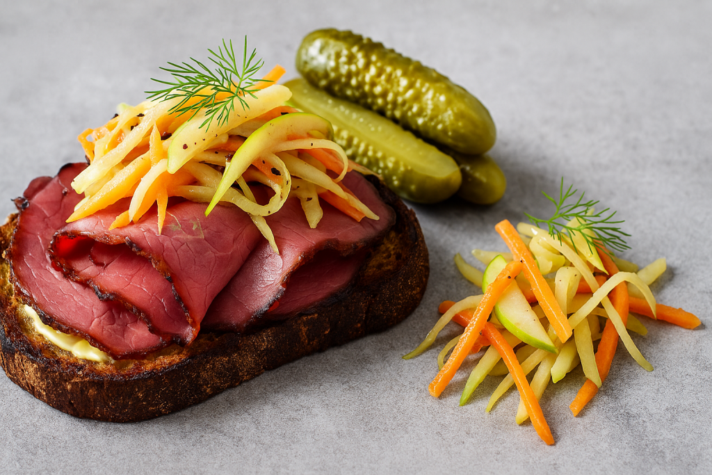 - Toast and butter the rye or sourdough, top with pastrami and add a spoonful of the slaw, then garnish with the pickles. Serve extra slaw on the side.