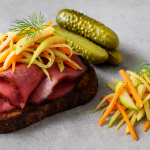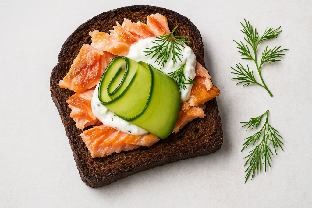 Salmon with pickled cucumber and dill and horseradish yoghurt on rye